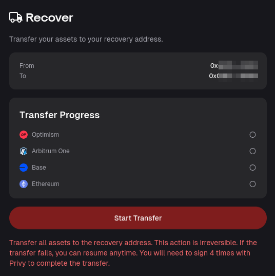 5. Tap Start Transfer. Your assets will be sent to your registered recovery address on each chain. The recovered asset will remain on the chain it was on in your Nekodex account. E.g. $OP will be sent on Optimism, $ARB will be sent on Arbitrum, etc.
