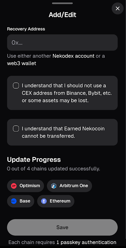 Step 1 in setting up is to choose a Recovery Address. You can use any EVM-compatible wallet with an address starting with `0x...` like Metamask, Rabby, Argent, or another Nekodex account.