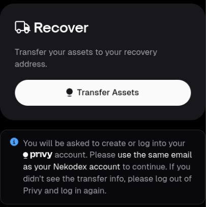 Fund Recovery lets you move all of your funds out of Nekodex if you lose access to your account, or just need to rescue your funds for whatever reason. Nekodex Fund Recovery uses [Privy](https://x.com/privy_io) ([privy.io](https://www.privy.io/)), a 3rd party service, to trigger movement of funds to your specified recovery address.